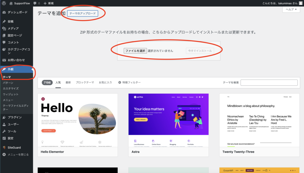 WordPressの管理画面を開き「外観」→「テーマ」→「新しいテーマを追加」→「テーマのアップロード」をクリックします。